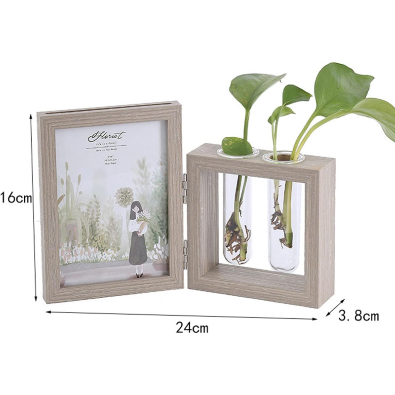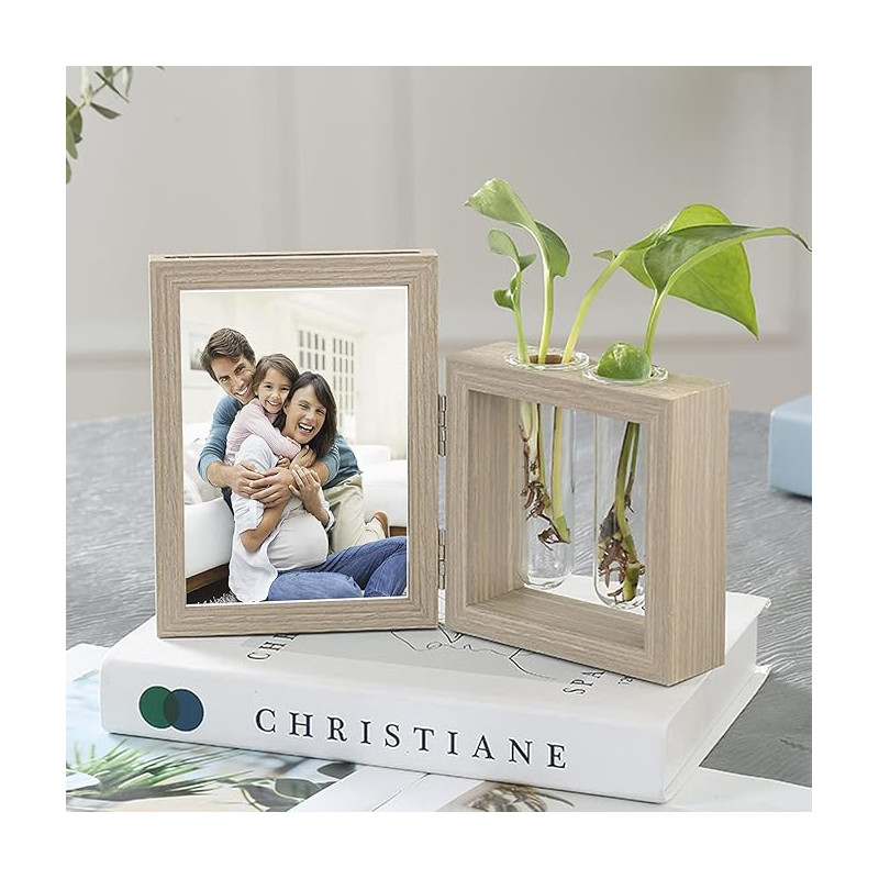 Cadre Photo de table en bois avec vase en verre hydroponique, décoration de bureau créative, AVEC 2 PHOTOS 15X10 CM, idéal pour offrir ou pour décoration Photo de bébé, Photo de BUREAU.
